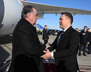 (250312) -- BISHKEK, 12 marzo, 2025 (Xinhua) -- El presidente de Kirguistán, Sadyr Japarov (d), recibe al presidente de Tayikistán, Emomali Rahmon, en el Aeropuerto Internacional de Manas, en Bishkek, Kirguistán, el 12 de marzo de 2025. El presidente tayiko, Emomali Rahmon, llegó a Kirguistán el miércoles para una visita de Estado, de acuerdo con el servicio de prensa del presidente kirguís. (Xinhua/Oficina del Presidente de la República Kirguisa) (jg) (da) (vf)