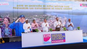 (250312) -- CORINTO, 12 marzo, 2025 (Xinhua) -- Imagen cedida por el Consejo de Comunicación y Ciudadanía de Nicaragua del 11 de marzo de 2025 del ministro de Transporte e Infraestructura de Nicaragua, Oscar Mojica (c), y el asesor presidencial para las Inversiones, Comercio y Cooperación Internacional de Nicaragua, Laureano Ortega (2-d), encabezando la recepción de nuevos equipos fabricados en China, en Corinto, Nicaragua. Puerto Corinto, la principal infraestructura portuaria de Nicaragua, recibió el martes nuevos equipos fabricados en China. La recepción de la maquinaria es parte del proyecto de mejoramiento de capacidades técnicas y operativas de la terminal. (Xinhua/Consejo de Comunicación y Ciudadanía de Nicaragua) (fc) (jg) (da) (vf)