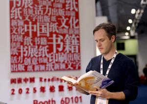 (250312) -- LONDRES, 12 marzo, 2025 (Xinhua) -- Un hombre lee en un estand que exhibe libros con temática china en la Feria del Libro de Londres, en Londres, Reino Unido, el 12 de marzo de 2025. La Feria del Libro de Londres (LBF, por sus siglas en inglés), uno de los eventos editoriales más importantes del mundo, inaugurado el martes, destaca los logros editoriales de China, las colaboraciones globales y la creciente influencia en la industria. (Xinhua/Li Ying) (ah) (ra) (vf)