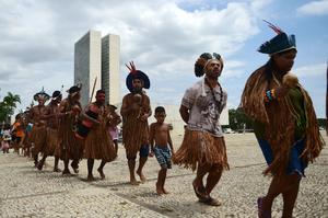 (250313) -- BRASILIA, 13 marzo, 2025 (Xinhua) -- Indígenas participan en una protesta contra la Ley del "Marco Temporal", en la Plaza de los Tres Poderes, en Brasilia, Brasil, el 13 de marzo de 2025. (Xinhua/Lucio Tavora) (lt) (jg) (ah) (vf)
