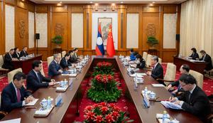 (250313) -- BEIJING, 13 marzo, 2025 (Xinhua) -- El ministro de Relaciones Exteriores chino, Wang Yi, también miembro del Buró Político del Comité Central del Partido Comunista de China, sostiene conversaciones con su homólogo de la República Democrática Popular Lao, Thongsavanh Phomvihane, en Beijing, capital de China, el 13 de marzo de 2025. (Xinhua/Zhai Jianlan) (jg) (ah) (ce)
