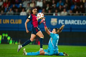 (250313) -- BARCELONA, 13 marzo, 2025 (Xinhua) -- Imagen del 12 de marzo de 2025 de Salma Paralluelo (i), de Barcelona, disparando el balón durante el partido de la Copa de la Reina entre Barcelona y Real Madrid, en Barcelona, España. (Xinhua/Joan Gosa) (rtg) (ra) (vf)