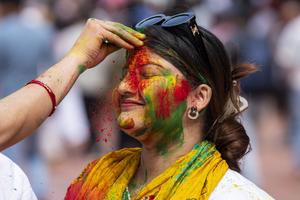 (250313) -- LALITPUR, 13 marzo, 2025 (Xinhua) -- Una mujer manchada con polvo de colores celebra el Festival Holi, en Lalitpur, Nepal, el 13 de marzo de 2025. Holi, el festival de los colores, marca el final del invierno y el comienzo de la temporada de primavera. (Xinhua/Hari Maharjan) (da) (ra) (vf)