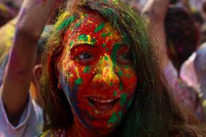 (250313) -- KATMANDU, 13 marzo, 2025 (Xinhua) -- Una mujer manchada con polvo de colores celebran el Festival Holi, en Katmandú, Nepal, el 13 de marzo de 2025. Holi, el festival de los colores, marca el final del invierno y el comienzo de la temporada de primavera. (Xinhua/Sulav Shrestha) (da) (ra) (vf)