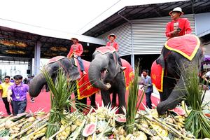 (250313) -- PATTAYA, 13 marzo, 2025 (Xinhua) -- Elefantes comen frutas durante un bufé de elefantes para conmemorar el Día Nacional del Elefante tailandés, en el Jardín Tropical Nong Nooch, en Pattaya, Tailandia, el 13 de marzo de 2025. El Día Nacional del Elefante tailandés se celebra anualmente el 13 de marzo en Tailandia. (Xinhua/Rachen Sageamsak) (rtg) (ra) (ce)