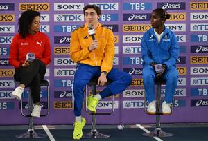 (250320) -- NANJING, 20 marzo, 2025 (Xinhua) -- (De izq. a der.) Ditaji Kambundji, de Suiza, Mondo Duplantis, de Suecia, y Zaynab Dosso, de Italia, asisten a una conferencia de prensa para el Campeonato Mundial de Atletismo en Pista Cubierta, en Nanjing, en la provincia de Jiangsu, en el este de China, el 20 de marzo de 2025. (Xinhua/Song Yanhua) (rtg) (ra) (vf)