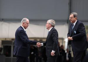 (250319) -- ANTIGUA OLIMPIA, 19 marzo, 2025 (Xinhua) -- Imagen del 18 de marzo de 2025 del presidente del Comité Olímpico Internacional (COI), Thomas Bach (c), estrechando la mano con el presidente de Grecia, Constantine Tassoulas (i), durante la ceremonia de inauguración de la 144ª sesión del Comité Olímpico Internacional (COI) en la Academia Olímpica Internacional, en la Antigua Olimpia, Grecia. (Xinhua/Cao Can) (jg) (da) (vf)