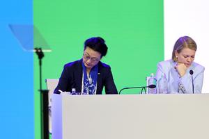 (250319) -- COSTA NAVARINO, 19 marzo, 2025 (Xinhua) -- La integrante de la junta ejecutiva del Comité Olímpico Internacional (COI), Li Lingwei (i), es vista durante la 144ª sesión del Comité Olímpico Internacional (COI), en Costa Navarino, Atenas, Grecia, el 19 de marzo de 2025. (Xinhua/Cao Can) (jg) (da) (vf)