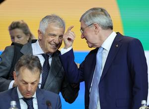 (250319) -- COSTA NAVARINO, 19 marzo, 2025 (Xinhua) -- El presidente del Comité Olímpico Internacional (COI), Thomas Bach (d), conversa con el candidato a la presidencia del COI, Juan Antonio Samaranch Jr., previo a la 144ª sesión del COI, en Costa Navarino, Atenas, Grecia, el 19 de marzo de 2025. (Xinhua/Cao Can) (jg) (da) (ce)