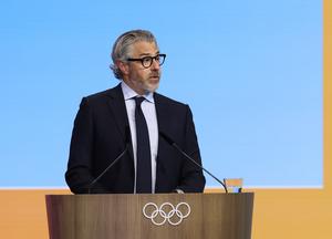 (250320) -- COSTA NAVARINO, 20 marzo, 2025 (Xinhua) -- Casey Wasserman, presidente del Comité Organizador de los Juegos Olímpicos de Los Angeles 2028, habla durante el segundo día de la 144ª sesión del Comité Olímpico Internacional (COI), en Costa Navarino, Grecia, el 20 de marzo de 2025. (Xinhua/Cao Can) (da) (ra) (vf)