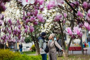 (250319) -- MILÁN, 19 marzo, 2025 (Xinhua) -- Imagen del 18 de marzo de 2025 de personas disfrutando de las flores de magnolia, en Milán, Italia. (Xinhua/Li Jing) (ah) (ce)