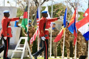 (250320) -- NAQURA, 20 marzo, 2025 (Xinhua) -- Imagen del 19 de marzo de 2025 de soldados de la Fuerza Provisional de las Naciones Unidas en Líbano (FPNUL) asistiendo a una ceremonia para conmemorar el 47 aniversario del establecimiento de la misión en su cuartel general, en Naqoura, en el sur de Líbano. El Consejo de Seguridad de la ONU estableció la FPNUL en marzo de 1978 para supervisar la retirada de las fuerzas israelíes del sur de Líbano y ayudar al Gobierno libanés a restablecer el control efectivo de la zona. Su mandato se amplió tras la guerra de 2006 para incluir la supervisión del alto el fuego y el apoyo a las fuerzas libanesas en el mantenimiento de la seguridad. (Xinhua/Ali Hashisho) (jg) (ah) (vf)
