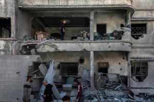 (250319) -- GAZA, 19 marzo, 2025 (Xinhua) -- Personas son vistas en un edificio destruido en un bombardeo israelí, en el vecindario de Sabra, en el sur de la Ciudad de Gaza, el 19 de marzo de 2025. Al menos 25 palestinos murieron y decenas más resultaron heridos el miércoles en el bombardeo israelí contra una vivienda en el vecindario de Sabra, en la Ciudad de Gaza, dijeron fuentes palestinas. (Xinhua/Rizek Abdeljawad) (ah) (vf)