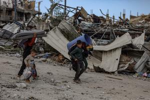 (250319) -- CIUDAD DE GAZA, 19 marzo, 2025 (Xinhua) -- Palestinos huyen del barrio de Shuja'iyya, en el este de la Ciudad de Gaza, el 19 de marzo de 2025. Decenas de familias palestinas huyeron el miércoles de sus hogares en diversas áreas de Gaza después de que el ejército israelí emitiera nuevas órdenes de evacuación, en las que advirtió sobre la intensificación de las operaciones militares. (Xinhua/Rizek Abdeljawad) (jg) (da) (ce)