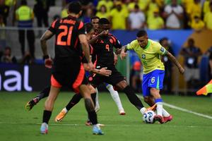 (250321) -- BRASILIA, 21 marzo, 2025 (Xinhua) -- Imagen del 20 de marzo de 2025 de Guilherme Arana (d), de Brasil, controlando el balón durante el partido de fútbol de las eliminatorias latinoamericanas para la Copa Mundial de la FIFA 2026 entre Brasil y Colombia, en Brasilia, Brasil. (Xinhua/Lucio Tavora) (rtg) (ra) (vf)