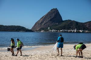 (250323) -- RIO DE JANEIRO, 23 marzo, 2025 (Xinhua) -- Imagen del 22 de marzo de 2025 de voluntarios recolectando basura durante una campaña de limpieza de playa, en la Playa Flamengo, en Río de Janeiro, Brasil. Con motivo del Día Mundial del Agua que se conmemora el sábado, varias ciudades en el estado de Río de Janeiro, en Brasil, lanzaron campañas de limpieza de playas a gran escala, con cientos de voluntarios trabajando juntos para remover basura marina, con el objetivo de concienciar al público sobre la conservación de los océanos y el desarrollo sostenible. (Xinhua/Wang Tiancong) (rtg) (ah)