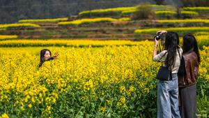 (250323) -- LIUPANSHUI, 23 marzo, 2025 (Xinhua) -- Imagen del 22 de marzo de 2025 de una turista posando para fotografías en un campo de flores de colza, en la aldea de Wayao del poblado de Mugang, en la ciudad de Liupanshui, en la provincia de Guizhou, en el suroeste de China. Más de 1.000 hectáreas de flores de colza están en plena floración en Mugang. (Xinhua/Tao Liang) (oa) (ah)