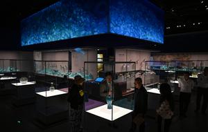 (250322) -- QIONGHAI, 22 marzo, 2025 (Xinhua) -- Imagen del 20 de marzo de 2025 de visitantes observando una exposición de reliquias recuperadas de dos antiguos naufragios descubiertos en el Mar Meridional de China en el Museo del Mar Meridional de China de Hainan de China, en Qionghai, en la provincia de Hainan, en el sur de China. Impulsada por el Foro de Boao para Asia, Qionghai ha construido una exquisita variedad de conglomerados rurales y se ha embarcado en un camino hacia la revitalización rural impulsada por el turismo. (Xinhua/Guo Cheng) (oa) (da)