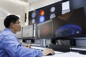 (250321) -- BEIJING, 21 marzo, 2025 (Xinhua) -- Imagen del 20 de marzo de 2025 de un investigador monitoreando actividades solares en el Centro de Predicción del Entorno Espacial del Centro Integrado de Información y Control de Operaciones del Proyecto Meridiano, en el distrito de Huairou de Beijing, capital de China. Una de las infraestructuras científicas clave de China, el Proyecto Meridiano Chino (CMP, por sus siglas en inglés), obtuvo exitosamente la aprobación nacional para su segunda fase el viernes. Impulsará la investigación científica de vanguardia y brindará apoyo clave a los servicios de pronóstico del clima espacial del país, según el Centro Nacional de Ciencias Espaciales de la Academia de Ciencias de China. El proyecto, también conocido como Red Terrestre de Monitoreo del Entorno Espacial, es la primera instalación terrestre integral de monitoreo del mundo que abarca el espacio Sol-Tierra, desde la atmósfera solar hasta el espacio cercano a la Tierra. (Xinhua/Jin Liwang) (rtg) (ra) (vf)