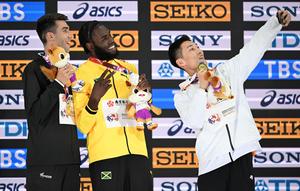 (250321) -- NANJING, 21 marzo, 2025 (Xinhua) -- (De izq. a der.) Hamish Kerr, de Nueva Zelanda, Raymond Richards, de Jamaica y Woo Sanghyeok, de República de Corea, se toman una fotografía durante la ceremonia de premiación de salto de altura masculino en el Campeonato Mundial de Atletismo en Pista Cubierta 2025, en Nanjing, en la provincia de Jiangsu, en el este de China, el 21 de marzo de 2025. (Xinhua/Song Yanhua) (oa) (ra) (ce)