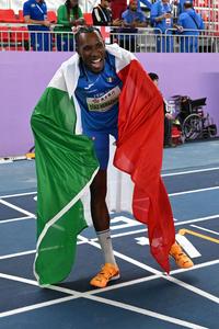 (250321) -- NANJING, 21 marzo, 2025 (Xinhua) -- Andy Díaz Hernández, de Italia, festeja al término de la final de triple salto masculino en el Campeonato Mundial de Atletismo en Pista Cubierta 2025, en Nanjing, en la provincia de Jiangsu, en el este de China, el 21 de marzo de 2025. (Xinhua/Song Yanhua) (rtg) (ra) (vf)