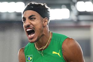(250321) -- NANJING, 21 marzo, 2025 (Xinhua) -- Almir Dos Santos, de Brasil, reacciona durante de la final de triple salto masculino en el Campeonato Mundial de Atletismo en Pista Cubierta 2025, en Nanjing, en la provincia de Jiangsu, en el este de China, el 21 de marzo de 2025. (Xinhua/Song Yanhua) (rtg) (ra) (vf)