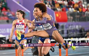 (250321) -- NANJING, 21 marzo, 2025 (Xinhua) -- Taliyah Brooks (frente), de Estados Unidos, compite durante los 60m vallas de pentatlón femenino durante el Campeonato Mundial de Atletismo en Pista Cubierta 2025, en Nanjing, en la provincia de Jiangsu, en el este de China, el 21 de marzo de 2025. (Xinhua/Song Yanhua) (rtg) (ra) (vf)