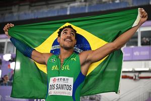 (250321) -- NANJING, 21 marzo, 2025 (Xinhua) -- Almir Dos Santos, de Brasil, festeja al término de la final de triple salto masculino en el Campeonato Mundial de Atletismo en Pista Cubierta 2025, en Nanjing, en la provincia de Jiangsu, en el este de China, el 21 de marzo de 2025. (Xinhua/Song Yanhua) (rtg) (ra) (vf)