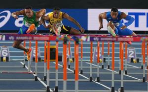 (250322) -- NANJING, 22 marzo, 2025 (Xinhua) -- (De izq. a der.) Rafael Pereira, de Brasil, Jerome Campbell, de Jamaica, y Lorenzo Ndele Simonelli, de Italia, compiten durante las eliminatorias de 60m vallas masculino durante el Campeonato Mundial de Atletismo en Pista Cubierta 2025, en Nanjing, en la provincia de Jiangsu, en el este de China, el 22 de marzo de 2025. (Xinhua/Li Bo) (oa) (da)