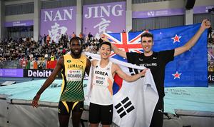 (250321) -- NANJING, 21 marzo, 2025 (Xinhua) -- (De izq. a der.) Raymond Richards, de Jamaica, Woo Sanghyeok, de República de Corea, y Hamish Kerr, de Nueva Zelanda, festejan al término de la final de salto de altura masculino en el Campeonato Mundial de Atletismo en Pista Cubierta 2025, en Nanjing, en la provincia de Jiangsu, en el este de China, el 21 de marzo de 2025. (Xinhua/Song Yanhua) (oa) (ra) (ce)