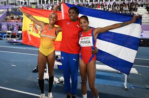 (250322) -- NANJING, 22 marzo, 2025 (Xinhua) -- (De izq. a der.) La ganadora del tercer lugar, Ana Peleteiro-Compaoré, de España, la ganadora del primer lugar, Leyanis Pérez Hernández, de Cuba, y la ganadora del segundo lugar, Liadagmis Povea, de Cuba, festejan al término de la final de triple salto femenino en el Campeonato Mundial de Atletismo en Pista Cubierta 2025, en Nanjing, en la provincia de Jiangsu, en el este de China, el 22 de marzo de 2025. (Xinhua/Song Yanhua) (oa) (da)