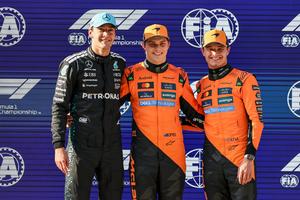 (250322) -- SHANGHAI, 22 marzo, 2025 (Xinhua) -- El piloto australiano de la escudería McLaren, Oscar Piastri (c), ganador de la pole position posa con el segundo lugar, el piloto británico de la escudería Mercedes, George Russell (i), y el tercer lugar, el piloto británico de la escudería McLaren, Lando Norris, al término de la clasificación del Gran Premio de China de Fórmula 1 en el Circuito Internacional de Shanghai, en Shanghai, en el este de China, el 22 de marzo de 2025. (Xinhua/Qian Jun) (rtg) (da)