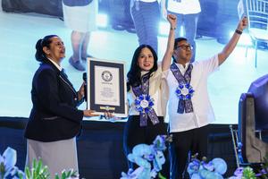 (250322) -- CIUDAD DE MALABON, 22 marzo, 2025 (Xinhua) -- Imagen del 21 de marzo de 2025 de la adjudicadora del Récord Mundial Guinness, Sonia Ushirogochi (i), entregando un certificado del Récord Mundial Guinness a Jeannie Sandoval (c), alcaldesa de la ciudad de Malabón, en la ciudad de Malabón, Filipinas. La ciudad logró exitosamente el Récord Mundial Guinness de la fila más larga de tazones de fideos con 6.549 tazones. (Xinhua/Rouelle Umali) (jg) (da)