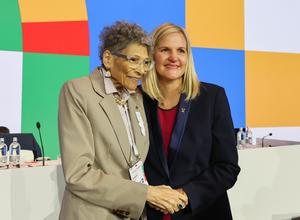 (250321) -- COSTA NAVARINO, 21 marzo, 2025 (Xinhua) -- Imagen del 20 de marzo de 2025 de Kirsty Coventry (d), y la miembro del COI, Anita DeFrantz, posando para la fotografía durante la 144ª sesión del Comité Olímpico Internacional (COI) el día de la elección del próximo presidente del Comité Olímpico Internacional, en Costa Navarino, Grecia. (Xinhua/Cao Can) (jg) (da) (vf)