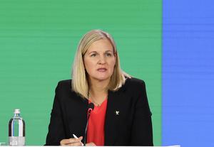 (250321) -- COSTA NAVARINO, 21 marzo, 2025 (Xinhua) -- Kirsty Coventry, recién elegida presidenta del Comité Olímpico Internacional (COI), habla durante el tercer día de la 144ª sesión del COI, en Costa Navarino, Grecia, el 21 de marzo de 2025. (Xinhua/Cao Can) (oa) (ra) (ce)