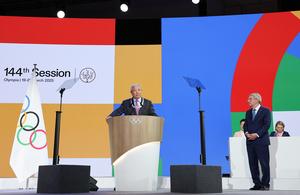 (250321) -- COSTA NAVARINO, 21 marzo, 2025 (Xinhua) -- Yu Zaiqing, vicepresidente del Comité Olímpico Chino y miembro del Comité Olímpico Internacional (COI), habla después de recibir la Orden Olímpica durante el tercer día de la 144ª sesión del COI, en Costa Navarino, Grecia, el 21 de marzo de 2025. (Xinhua/Cao Can) (oa) (ra) (ce)