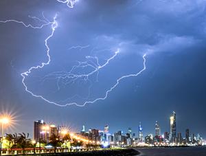 (250322) -- CIUDAD DE KUWAIT, 22 marzo, 2025 (Xinhua) -- Imagen del 22 de marzo de 2025 de relámpagos sobre el horizonte de la Ciudad de Kuwait, Kuwait. (Xinhua/Asad) (oa) (da)