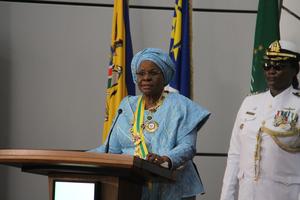 (250321) -- WINDHOEK, 21 marzo, 2025 (Xinhua) -- Netumbo Nandi-Ndaitwah (frente) habla durante la ceremonia de investidura presidencial, en Windhoek, Namibia, el 21 de marzo de 2025. Netumbo Nandi-Ndaitwah prestó juramento el viernes como la primera mujer en ocupar la presidencia de Namibia tras ganar la elección el año pasado. (Xinhua/Musa Kaseke) (jg) (da) (ce)