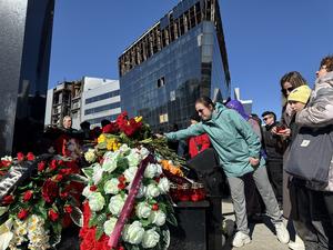 (250322) -- MOSCU, 22 marzo, 2025 (Xinhua) -- Personas depositan flores en el monumento a las víctimas del atentado terrorista cerca del Ayuntamiento de Crocus, en los suburbios de Moscú, Rusia, el 22 de marzo de 2025. El 22 de marzo de 2024, un atentado terrorista contra la sala de conciertos del Ayuntamiento de Crocus de Moscú, seguido de un gran incendio, resultó en al menos 144 muertos y 551 heridos, de acuerdo con estadísticas oficiales. (Xinhua/Alexander Zemlianichenko Jr) (jg) (da)