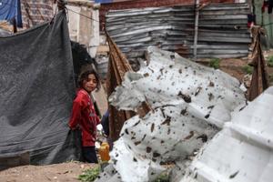 (250322) -- CIUDAD DE GAZA, 22 marzo, 2025 (Xinhua) -- Imagen del 21 de marzo de 2025 de una niña palestina desplazada vista entre tiendas de campaña temporales junto a grandes montones de basura, en la Ciudad de Gaza. (Xinhua/Rizek Abdeljawad) (oa) (da)