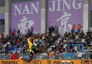(250323) -- NANJING, 23 marzo, 2025 (Xinhua) -- Wayne Pinnock, de Jamaica, compite durante la final de salto de longitud masculino en el Campeonato Mundial de Atletismo en Pista Cubierta 2025, en Nanjing, en la provincia de Jiangsu, en el este de China, el 23 de marzo de 2025. (Xinhua/Li Bo) (oa) (da)