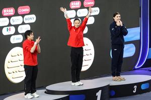 (250406) -- GUADALAJARA, April 6, 2025 (Xinhua) -- Gold medalist Chen Yuxi (C), silver medalist Quan Hongchan (L) of China and bronze medalist Andrea Spendolini Sirieix of Britain react during the awarding ceremony for the women 10m platform final at the World Aquatics Diving World Cup 2025 in Guadalajara, Jalisco, Mexico, on April 5, 2025. (Photo by Diana Marquez/Xinhua)