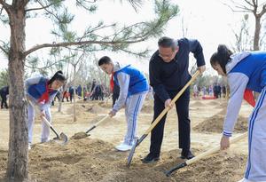 (250403) -- BEIJING, 3 abril, 2025 (Xinhua) -- Li Qiang planta un árbol durante una actividad voluntaria de plantación de árboles, en el distrito de Fengtai de Beijing, capital de China, el 3 de abril de 2025. Xi Jinping y otros líderes del Partido y del Estado, entre ellos Li Qiang, Zhao Leji, Wang Huning, Cai Qi, Ding Xuexiang, Li Xi y Han Zheng, llegaron por la mañana al lugar de plantación de árboles a orillas de un río en el distrito de Fengtai y plantaron árboles con los funcionarios y los habitantes locales. (Xinhua/Liu Bin) (jg) (ah) (ce)