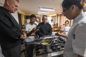 (250403) -- LA HABANA, 3 abril, 2025 (Xinhua) -- Imagen del 2 de abril de 2025 de la chef china, Wang Yan (d), impartiendo una clase a un grupo de chefs cubanos durante un curso para ser capacitados en la elaboración de comida típica china, en La Habana, capital de Cuba. Un grupo de chefs cubanos participa en un taller impartido por una especialista china a los cocineros que trabajan en los hoteles de La Habana, donde se alojarán los turistas que vengan a Cuba desde China. (Xinhua/Joaquín Hernández) (jh) (rtg) (ra) (ce)