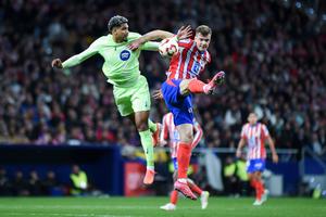 (250403) -- MADRID, 3 abril, 2025 (Xinhua) -- Imagen del 2 de abril de 2025 de Ronald Araujo (i), de FC Barcelona, disputando el balón con Alexander Sorloth, de Atlético de Madrid, durante el partido de fútbol de vuelta de la semifinal de la Copa del Rey entre FC Barcelona y Atlético de Madrid, en el Estadio Metropolitano Riyadh Air, en Madrid, España. (Xinhua/Gustavo Valiente) (rtg) (ra) (ce)