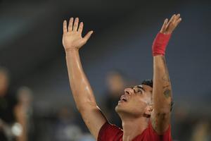 (250403) -- MONTEVIDEO, 3 abril, 2025 (Xinhua) -- Imagen del 2 de abril de 2025 del jugador Luis Ramos, de América de Cali de Colombia, festejando su anotación durante el partido del grupo C de la jornada 1 de la Fase de Grupos de la Copa Conmebol Sudamericana, ante Racing de Uruguay, celebrado en el Estadio Centenario, en Montevideo, capital de Uruguay. (Xinhua/Nicolás Celaya) (nc) (rtg) (ra) (vf)