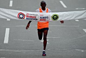 (250407) -- BELGRADO, 7 abril, 2025 (Xinhua) -- Imagen del 6 de abril de 2025 del keniano Gilbert Kipleting Chumba cruzando la línea de meta para ganar la categoría masculina del 38 maratón de Belgrado, en Belgrado, Serbia. (Xinhua/Predrag Milosavljevic) (oa) (ah) (vf)
