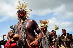 (250408) -- BRASILIA, 8 abril, 2025 (Xinhua) -- Personas indígenas participan en una manifestación en el Campamento "Tierra Libre", un campamento de protesta para exigir la demarcación de tierras y defender los derechos culturales, en Brasilia, Brasil, el 8 de abril de 2025. (Xinhua/Lucio Tavora) (lt) (oa) (ah) (ce)