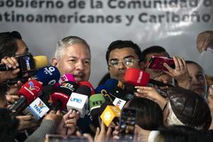 (250408) -- TEGUCIGALPA, 8 abril, 2025 (Xinhua) -- El canciller hondureño, Enrique Reina (i), realiza declaraciones a los representantes de los medios de comunicación durante la Reunión de Cancilleres de la IX Cumbre de la Comunidad de Estados Latinoamericanos y Caribeños (CELAC), en Tegucigalpa, capital de Honduras, el 8 de abril de 2025. (Xinhua/David de la Paz) (dp) (jg) (ra) (vf)