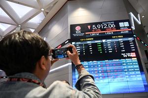 (250408) -- YAKARTA, 8 abril, 2025 (Xinhua) -- Un hombre toma fotografías de un panel que muestra el Índice Compuesto de Precios de Acciones en el edificio de la Bolsa de Valores de Indonesia, en Yakarta, Indonesia, el 8 de abril de 2025. El mercado de valores de Indonesia interrumpió temporalmente sus operaciones durante 30 minutos el martes por la mañana después de que el índice principal de desplomara un 9,19 por ciento en la apertura, tras un largo feriado por el festival de Eid al-Fitr. (Xinhua/Agung Kuncahya B.) (jg) (ra) (ce)